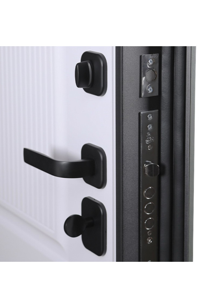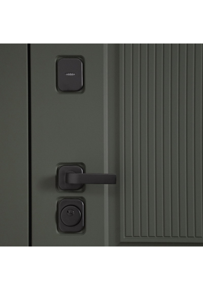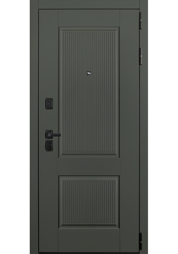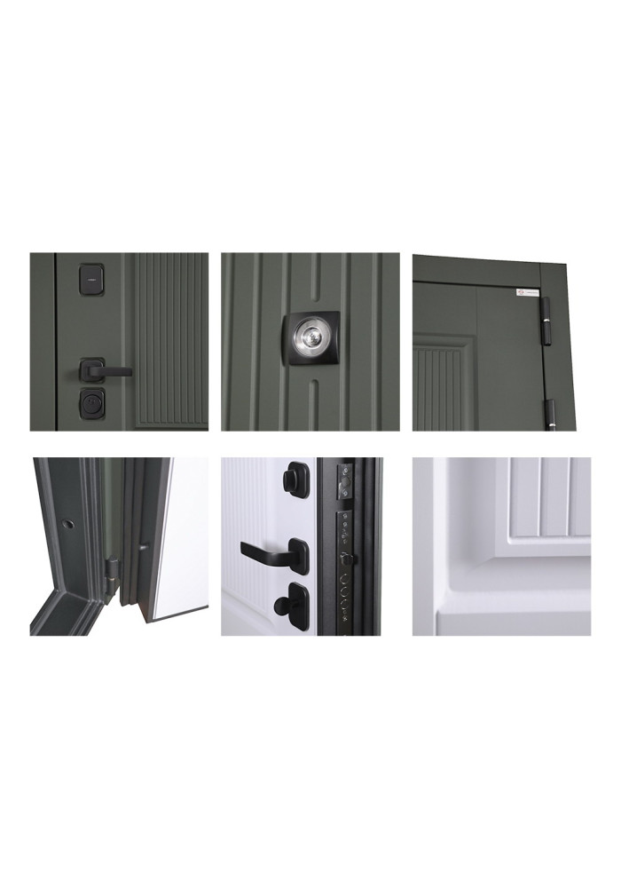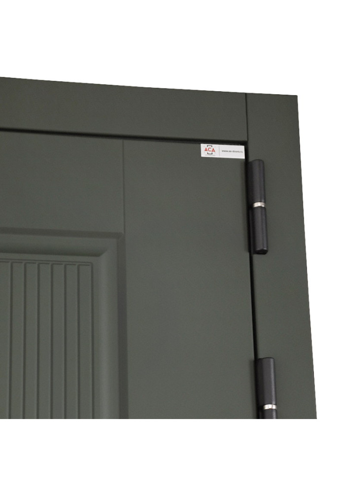 • Наружный лист металла: Лист металла 1,5 мм. Панель МДФ 10 мм. Объемная фрезеровка. Цвет "Силк Олива". Наличник МДФ 80 мм.
